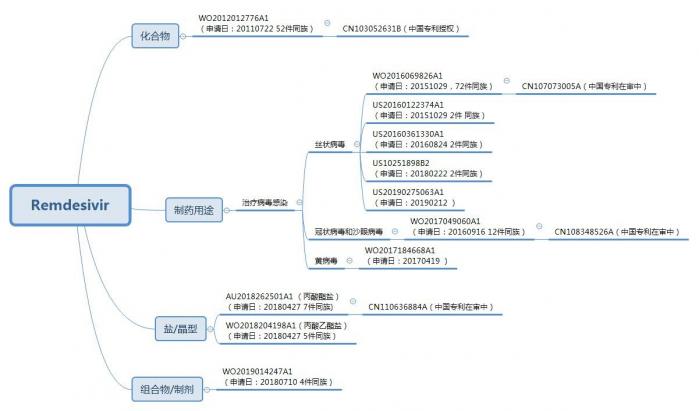 瑞德西韦在专利上的布局如何?据林宇清团队调查,早在2011年,吉利德公司就申请了化合物专利,并通过52件同族进行了从技术到区域的全面布局,涉及41个国家、地区和专利组织,除药企传统布局的中美欧日韩以外,还在一些发展中国家,如古巴、智利、秘鲁、越南、菲律宾、黑山、萨尔瓦尔、摩尔多瓦等国家进行了布局;同时,从2013年开始布局针对病毒感染适应症的用途专利,近年来又布局了药物的盐及晶型以及制剂专利。其中化合物、制药用途、盐/晶型等均在中国进行了布局。